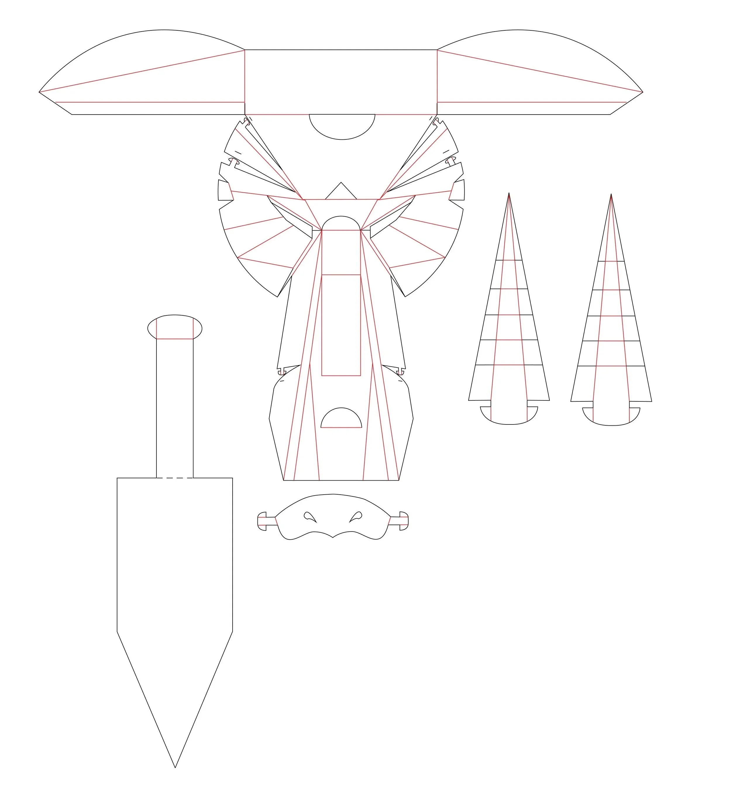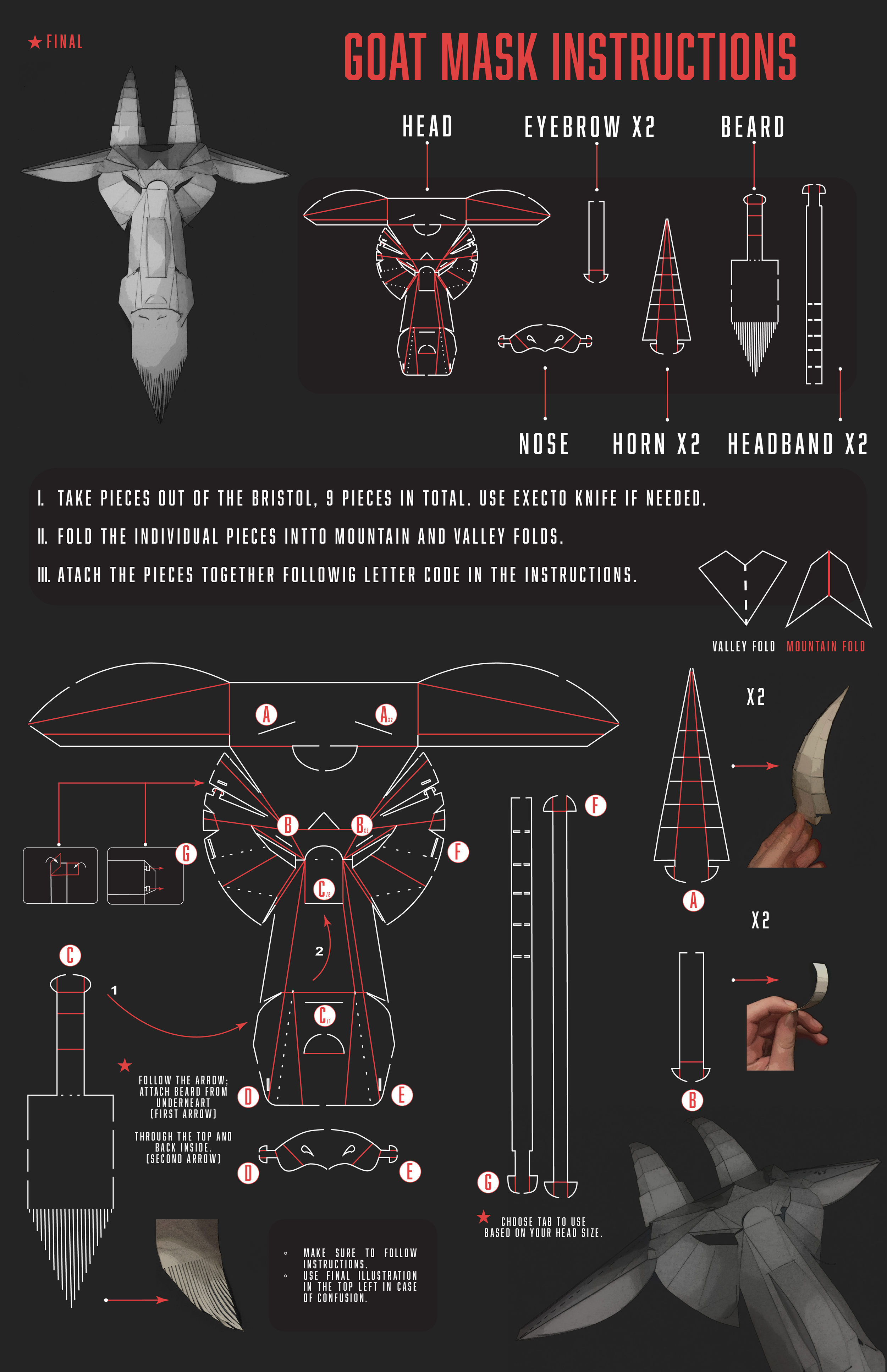 Created instructions based on the final cutout of the mask using Illustrator. Labeled all the parts and illustrated various types of folds, writing clear instructions on how to correctly assemble all components.