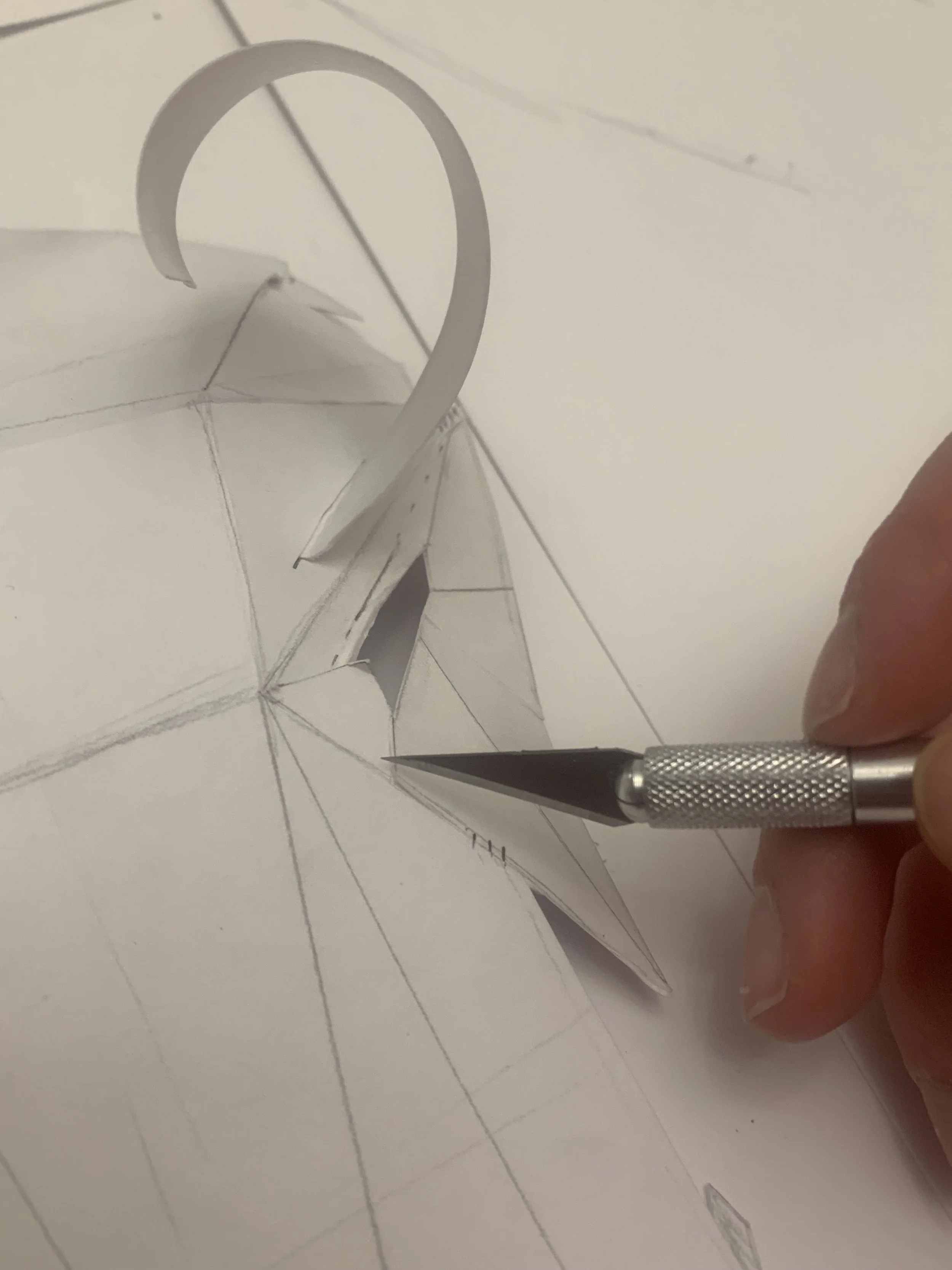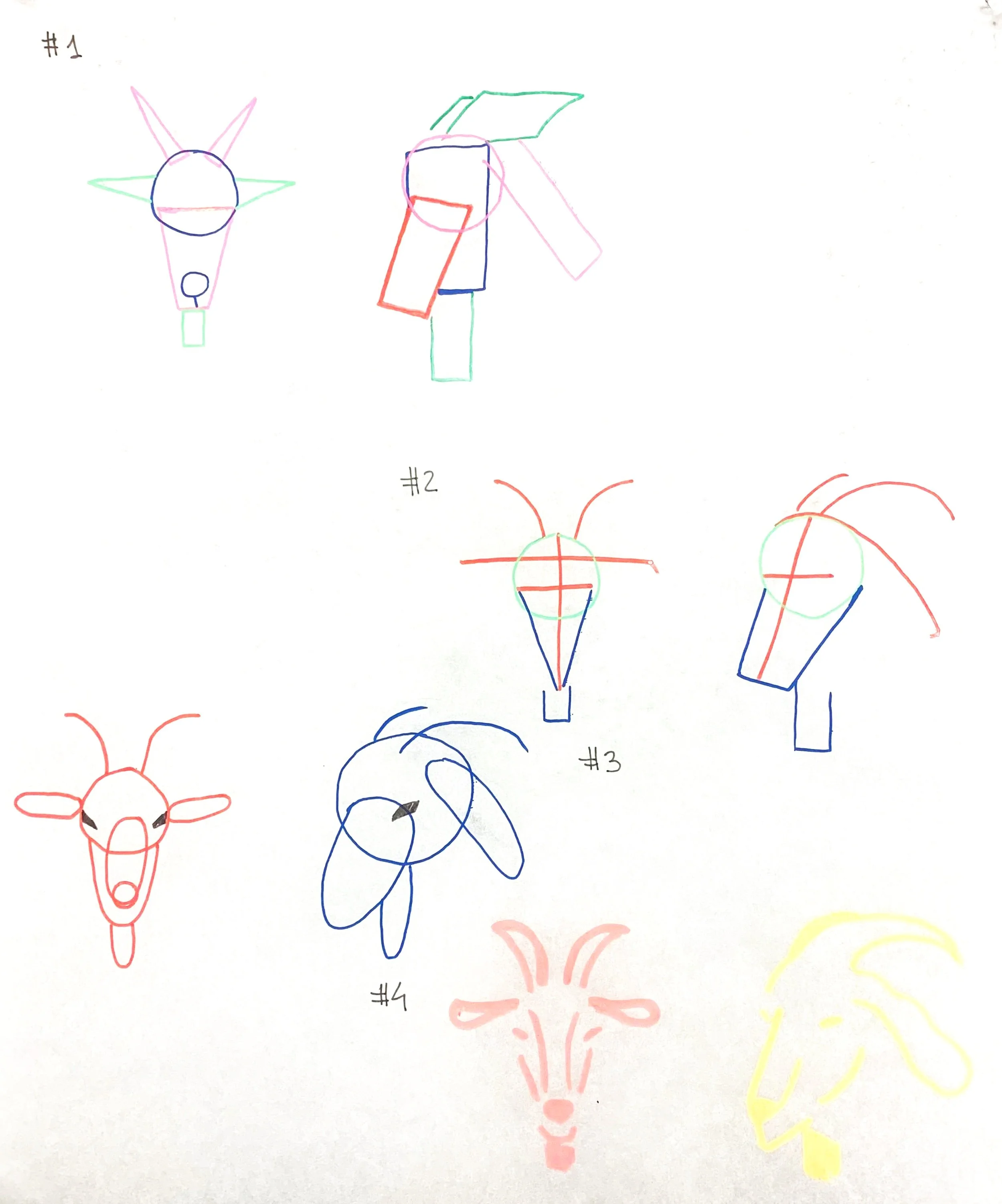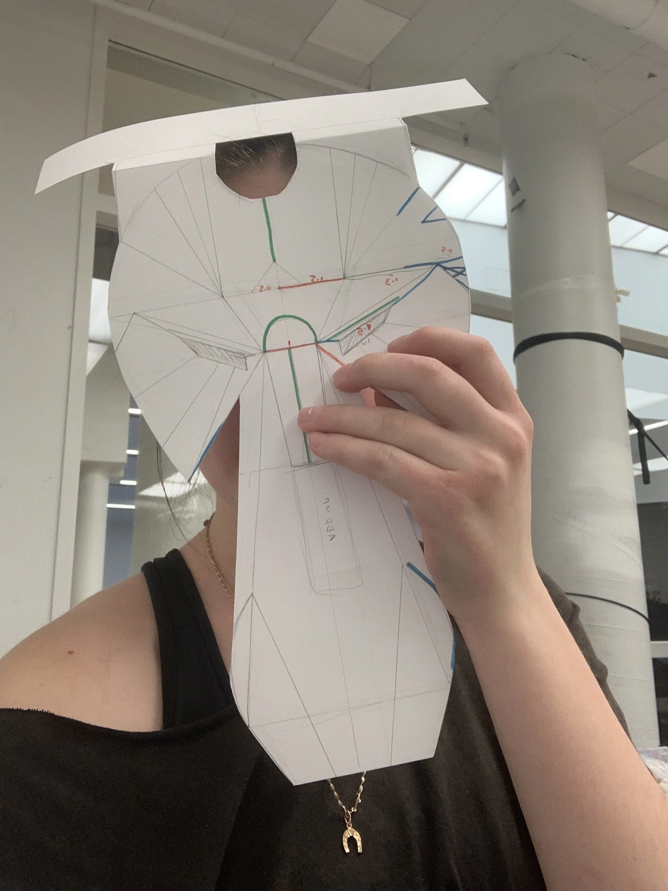 Experimented with 3D shapes using Bristol board. Created eight prototypes of each mask part and began taking measurements while brainstorming different forms of the goat’s main features.