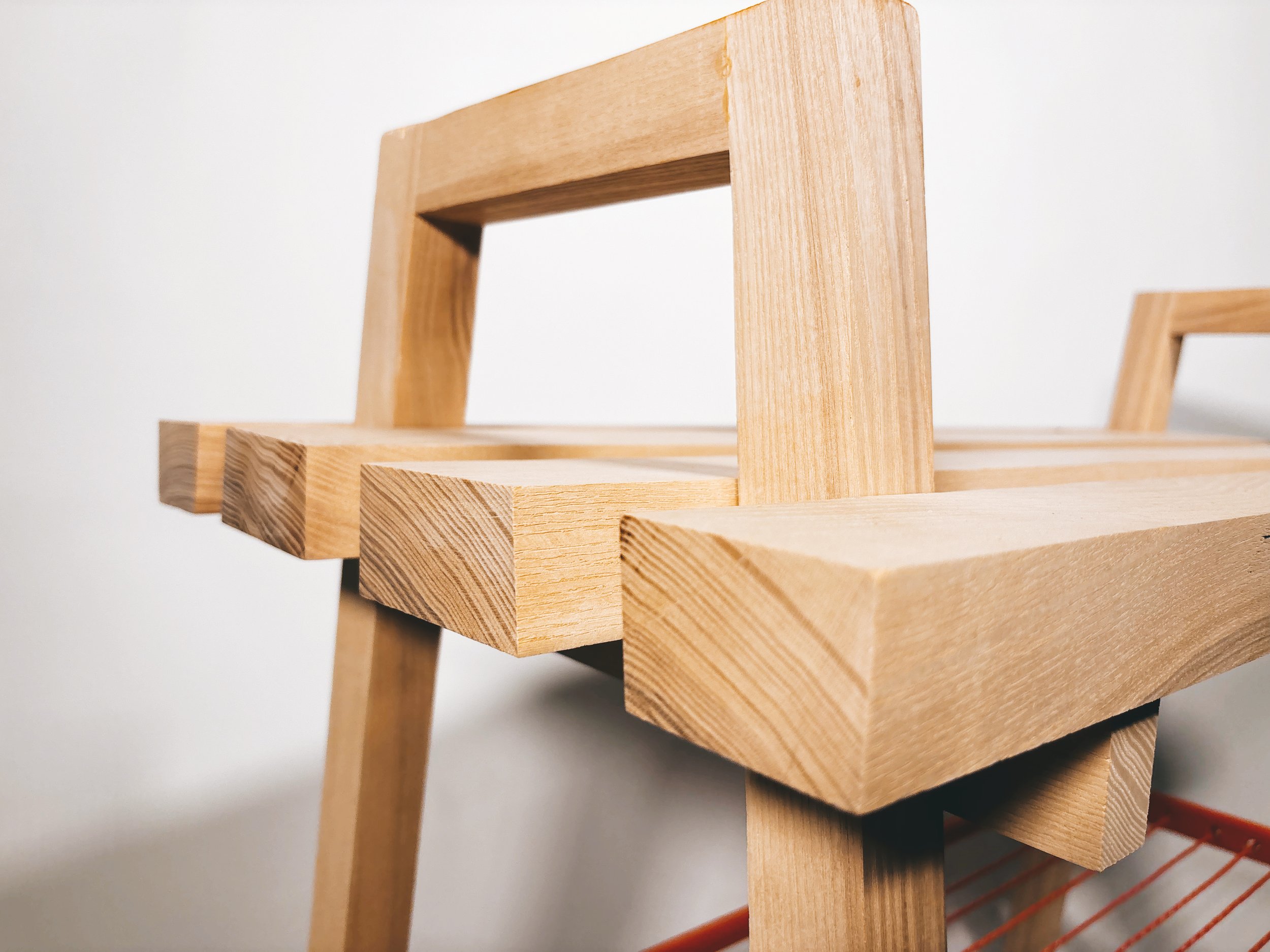 Used White Oak, Neon Orange spray paint, climbing rope, and clear finish.